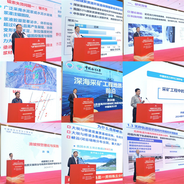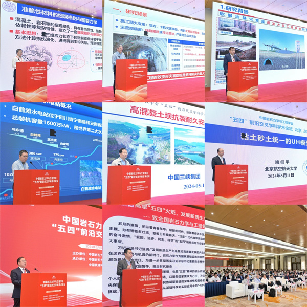 刘胜院士、李惠院士、殷跃平院士、周创兵院士分别以《DFX:电力电子芯片和封装高良率和极致可靠性协同设计方法与技术》《科学计算新范式:智能计算》《西部山区城镇重大地质灾害与地质安全保障研究》《渗流变形耦合效应与库坝安全》为题做主旨报告。 哈尔滨工业大学凌贤长教授,武汉大学刘泉声教授,中国科学院武汉岩土力学研究所李海波研究员,中国铁道科学研究院集团有限公司张玉芳研究员,中国海洋大学贾永刚教授,北京邮电大学、深部岩土力学与地下工程国家重点实验室乔建永教授,成都理工大学许强教授,河海大学高玉峰教授,中国国家铁路集团有限公司赵国堂研究员,清华大学冯西桥教授,中国科学院武汉岩土力学研究所陈卫忠研究员,东南大学刘松玉教授,中国电建集团华东勘测设计研究院有限公司张春生正高,中国长江三峡集团有限公司李文伟正高,北京航空航天大学姚仰平教授分别以《预应力锚索快速高效施工先进技术与数控装备》《煤矿深部巷道碎胀大变形灾害控制及灾变环境下TBM快速成巷技术》《岩石动力学及岩体爆破动力灾害防控研究进展与思考》《巨型滑坡机理》《深海采矿工程地质与环境前沿》《采矿工程中的前沿数学方法》《滑坡预警理论与实践》《峡谷/河谷场地地震波动理论及工程应用》《复杂环境高铁轨道高平顺性实现与保持技术》《力-化-生耦合的生物力学理论及其应用》《地下工程层状岩体多尺度变形破坏机理与灾害防控》《岩土工程固碳协同加固技术创新与应用》《柱状节理玄武岩的工程利用》《高混凝土坝抗裂耐久保障关键技术》《粘土砂土统一的UH模型》做专题报告。 会上,学会青年工作委员会主任委员、国际岩石力学学会(ISRM)副主席、同济大学张丰收教授宣读了《“五四”倡议书》,号召广大岩石力学科技工作者高擎“五四”火炬,坚持开发科学与科技创新。