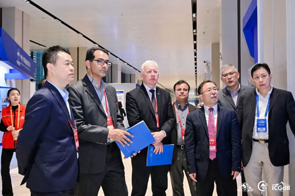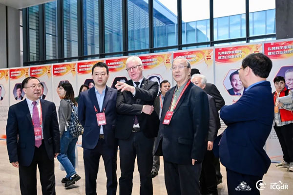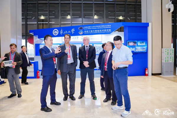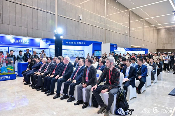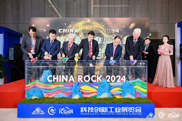 中国工程院院士周丰峻,中国工程院院士、中国岩石力学与工程学会副理事长殷跃平,日本工程院院士陈光齐,中国岩石力学与工程学会党委副书记杨晓杰,国际岩石力学与岩石工程学会副主席Milorad Jovanovski教授、张丰收教授,加拿大多伦多大学Giovanni Grasselli教授,日本爱媛大学Netra Bhandary教授,澳大利亚阿德莱德大学Murat Karakus教授以及澳大利亚科廷大学Mostafa Sharifzadeh等专家与展商代表出席开展仪式。开展仪式由ISRM中国国家小组副主席、学会国际事务秘书处副秘书长、山东大学王利戈教授和四川大学教授陈辰副教授主持。 各位嘉宾在热烈的掌声中共同举起象征科技创新的彩砂,将其缓缓注入展板,寓意着岩石力学与工程领域科技工作者齐聚一堂、汇聚成塔、凝聚智慧,共同推动科学研究迈向新的高峰,同时也正式拉开了本届CHINA ROCK 2024科技创新工业展览会的帷幕。