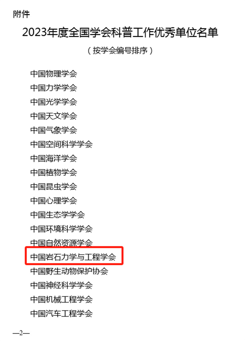 中国岩石力学与工程学会第九次获评"全国学会科普工作优秀单位"