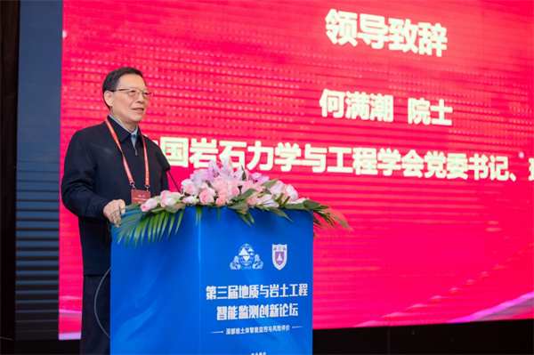 中国岩石力学与工程学会党委书记、理事长、中国科学院何满潮院士出席会议并致辞。何满潮理事长从“李约瑟之问”和“钱学森之问”引出知识共享和“开放科学”的重要性,倡导科学家之间要开展无私的无边界的交流与合作,以国家重大需求为己任,众志成城,攻坚克难。他强调,地质与岩土工程智能监测分会要引领学科发展,致力于产出一流水平的科技创新成果和培养一流水平的创新人才,在国家重大工程建设和运维中要充分发挥科技支撑作用,特别是在智能监测领域的理论、技术和方法创新上,要提供强有力的科技支持与服务。