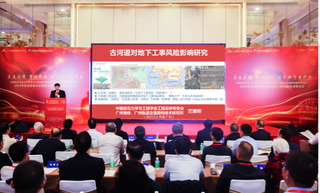 中国岩石力学与工程学会常务副秘书长牛晶蕊受学会党委委托出席会议并致辞。住建部科技委城市轨道交通建设专委会常务副主任金淮,广州地铁集团副总经理/大湾区轨道交通专家委主任王晖,工程实例专委会主任委员/盾研所首席专家竺维彬,工程实例专委会副主任委员/盾研所总顾问张志良,盾研所所长钟长平,支撑单位广州地铁工程咨询有限公司党委书记陈乔松、执行董事/总经理王洪东等出席了会议。会议由工程实例专委会秘书长/盾研所首席顾问米晋生主持。会上,竺维彬总作了题为《古河道对地下工事风险影响研究》主旨报告。住建部科技委城市轨道交通建设专业委员会常务副主任金淮、广州地铁设计研究院股份有限公司资深总工史海欧、广东华隧建设集团股份有限公司总工易觉、中建四局轨道交通事业部总工刘荣旭、广州地铁工程咨询有限公司副总经理兼总工黄威然等,分别就《智能隐患识别与质量安全大模型研究》、《软土地层盾构隧道病害案例分析和治理》、《超大直径TBM/泥水双模盾构实践与展望》、《多重敏感环境下小半径急曲线盾构施工关键技术研究》、《复合地层机械法联络通道工程实践研究》等主题作主旨报告。