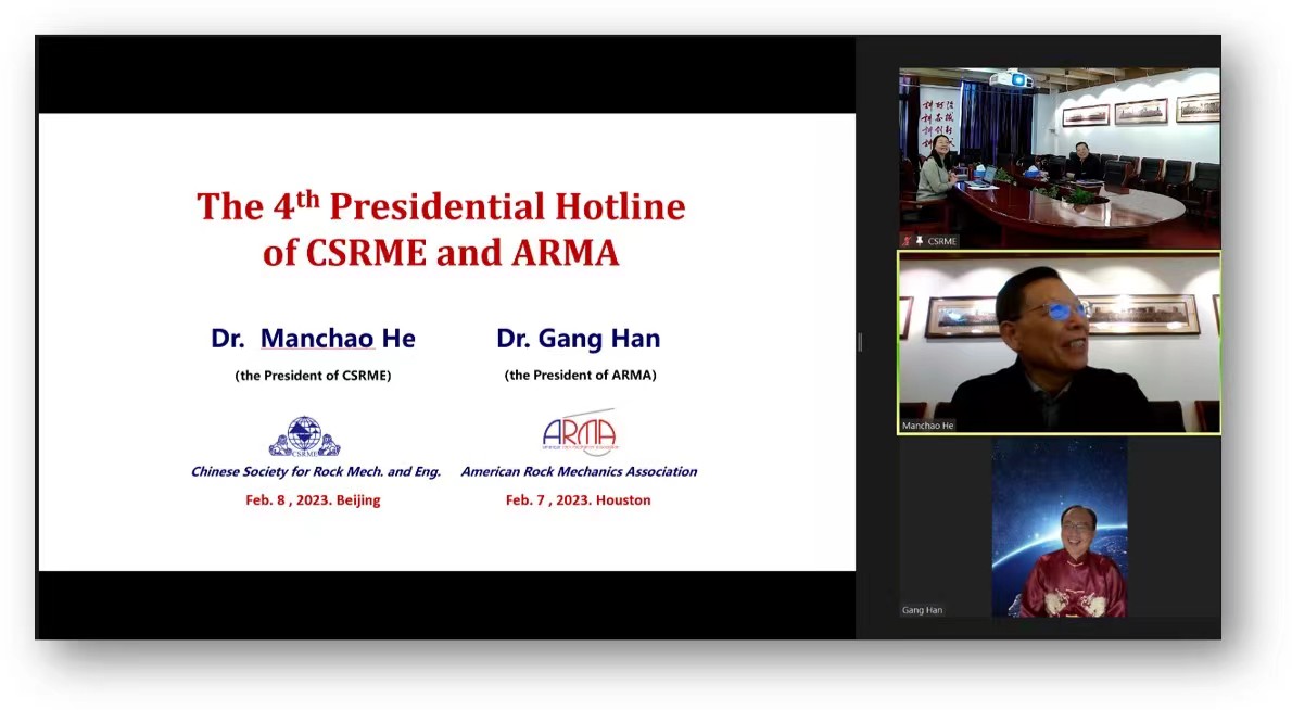 北京时间2023年2月8日上午,中国岩石力学与工程学会(CSRME)理事长何满潮院士与美国岩石力学学会(ARMA)主席Gang Han博士举行了中美岩石力学学会第四次主席热线会谈。