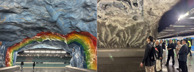 会后,中国代表团现场参观了号称“工程与艺术完美结合”的典范工程——斯德哥尔摩地铁工程。启用于1950年的斯德哥尔摩地铁具有独特的无支护隧道,至今已有75年历史,稳定性良好。斯德哥尔摩地铁隧道利用坚固的基岩,在开凿后直接保留裸露的岩壁,形成了粗犷而原始的空间美学。无支护的地铁隧道不仅经受住了70余年的安全考验,更孕育出世界独一无二的“地下艺术长廊”。艺术家们以岩壁为画布,创作了包含从史前岩画风格的彩绘到现代装置的绘画与雕塑,使地铁系统成为全球最长的艺术展览空间。这种工程与艺术的创造性结合,既体现了尊重自然的地域智慧,更展现了将功能性基础设施升华为文化载体的前瞻思维,为当代城市公共空间设计提供了极具启发性的范本。
