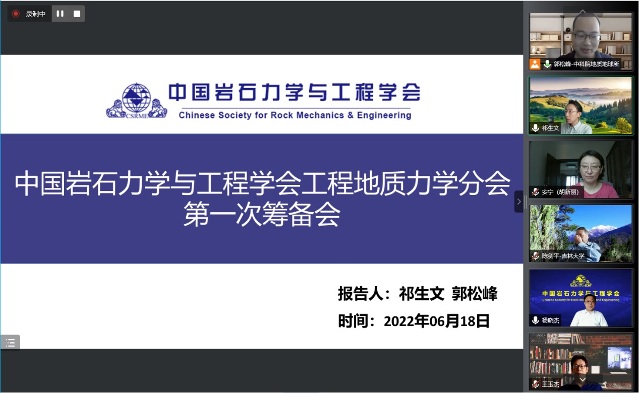 2022年6月18日 上午,工程地质力学分会筹备会以视频方式召开,会议由工程地质力学分会(筹)发起人、中国科学院地质与地球物理研究所祁生文研究员主持,学会党委副书记、秘书长杨晓杰,副秘书长牛晶蕊,分会拟任负责人吉林大学陈剑平教授、中国地质大学(武汉)胡新丽教授、中国科学院武汉岩土力学研究所李邵军研究员、太原理工大学李彦荣教授、中国水利水电科学研究院王玉杰教高、洛阳理工学院黄志全教授、建设综合勘察研究设计院有限公司傅志斌教高、长安大学晏长根教授,以及筹备组20余人参加了会议。