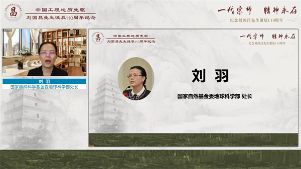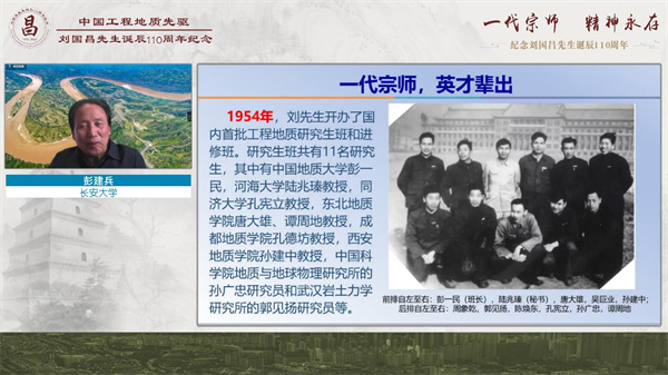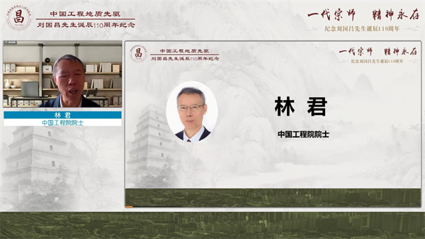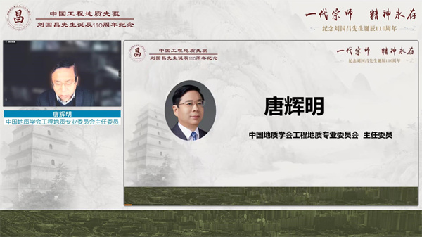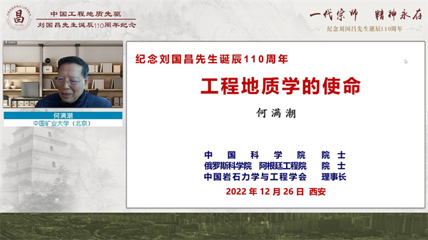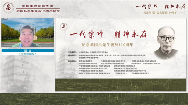 今年是我国区域工程地质理论体系创始人、著名工程地质学家刘国昌先生诞辰110周年,为了缅怀刘国昌先生为我国工程地质教育事业所做出的杰出贡献,学习和继承他为国奉献、为国育才的精神,12月26日,由中国地质学会和中国岩石力学与工程学会主办,中国地质学会工程地质专业委员会、长安大学、吉林大学、中国科学院地质与地球物理研究所、国家自然科学基金委地学部等联合承办的刘国昌先生诞辰110周年纪念活动在西安长安大学举行。由于受疫情影响,本次纪念活动采用线上形式举行,100余名特邀嘉宾参加了主会场活动,3.46万人次观看了活动直播。