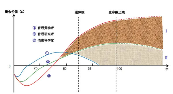 在此基础上,何院士团队创造性地建立了人生的价值模型。对于一个普通劳动者,在生命开始之初是作为一个社会资源的消耗者存在的,但在工作之后,便由消费者转变为生产者,当生产大于消耗时,便产生了剩余价值,可为社会做出贡献。对于一个大学生或者是研究生,因为学习时间较长,消耗的社会资源更大,消耗和生产所匹配的零点出现得更晚,但是到了生命结束的时期,其创造的技术仍然可以创造社会价值,并在一定时间后逐渐消减。对于一个杰出科学家,即使在生命结束的时期,其社会影响力仍然可以保持很长的时间。因此,国家重视研究生培育的重要使命,是为了创造更多的剩余价值,让国家更加强盛。