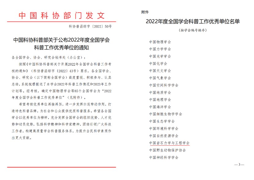 2022年12月28日,根据《中国科协科普部关于公布2022年度全国学会科普工作优秀单位的通知》(科协普函综字〔2022〕50号)发文,中国岩石力学与工程学会荣获2022年度全国学会科普工作优秀单位称号。我会已连续五年获此殊荣。