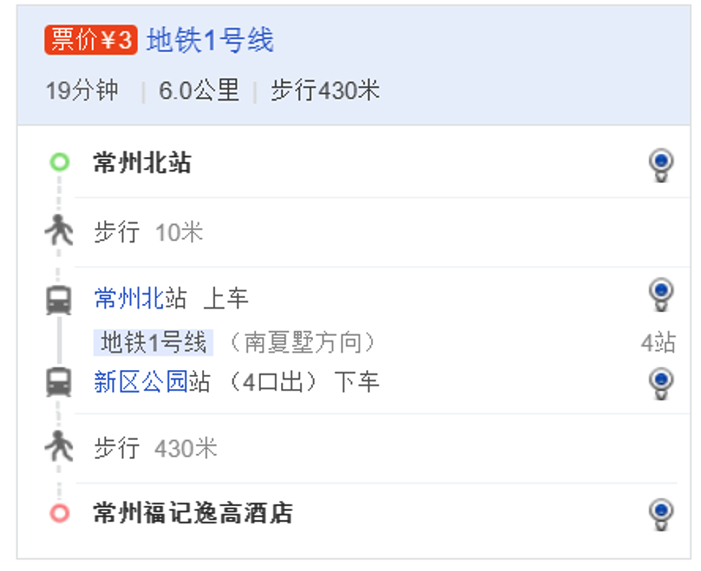 从常州北站乘坐地铁1号线前往常州福记逸高大酒店,距离约6公里,耗时约19分钟,花费约3元。