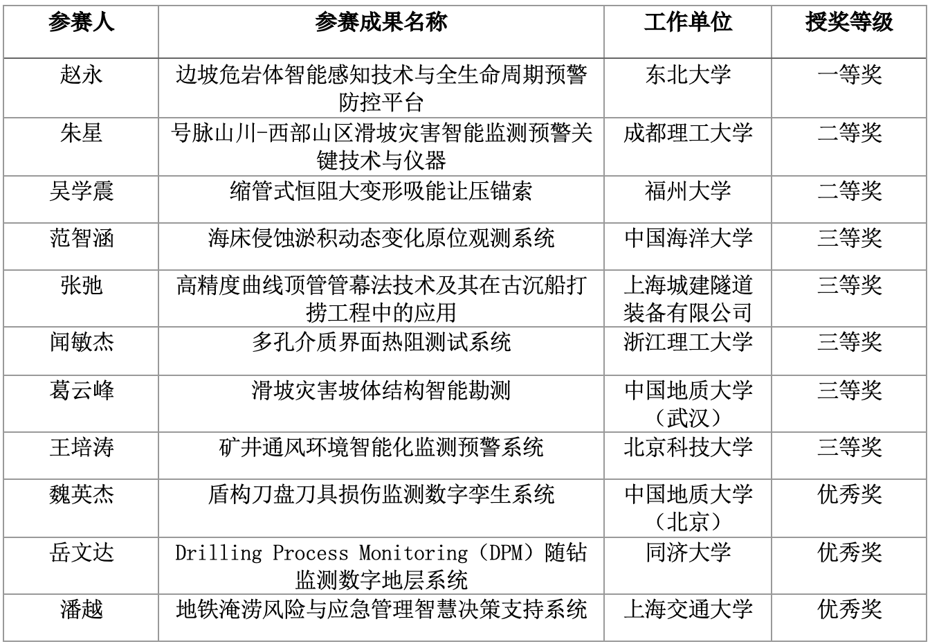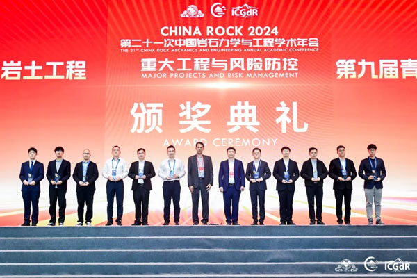 决赛展板展示阶段,选手们就项目特色和创新创业闪光点于CHINA ROCK 2024科技创新工业展览会进行了展示,吸引了大量与会专家驻足观看。 现场决赛演讲环节邀请了7位专家作为决赛评委团:欧洲科学院外籍院士,汕头大学,沈水龙教授;绍兴文理学院副校长,胡云进教授;中国水电顾问集团成都勘测设计研究院,施裕兵教授级高工;青年工作委员会第七届、第八届主任委员,同济大学,谢雄耀教授;长江水利委员会长江科学院,周黎明教授级高工;浙江大学,刘福深研究员;清华大学,赵志宏副教授。决赛现场还邀请到了独家赞助商“专家宝”项目总监董青女士。 决赛现场,选手通过演讲展示了自身项目的创新点与创业成果,评委团专家对选手表现和项目成果进行了精彩点评;经过评委打分和现场观众投票,最终决出一等奖一名、二等奖两名、三等奖五名、优秀奖三名。获奖名单如下: 最后,本届“双创”大赛决赛评委团主席沈水龙教授和独家赞助商专家宝项目总监董青女士为本届大赛致辞。董青女士对各位选手的成果高度肯定,认为创新成果从调研、研发到得到市场认可是历经坎坷的;沈水龙教授对各位选手的精彩表现和高水平创新成果做出了高度评价,鼓励青年学者再接再厉、继续突破。 11月3日下午,在CHINA ROCK 2024第二十一次中国岩石力学与工程学术年会闭幕式上,举行了盛大的颁奖典礼。至此,第九届“专岩杯”青年岩石力学与岩土工程创新创业大赛成功落幕。