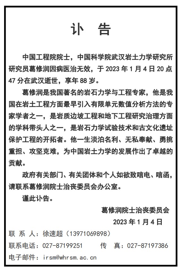 中国共产党党员、中国工程院院士、中国岩石力学与工程学会第三届、第四届理事会理事,第五届理事会名誉理事,岩石力学与工程专家葛修润同志,因病医治无效,于 2023 年 1 月 4 日 20 时 47 分在武汉逝世,享年 88 岁。
