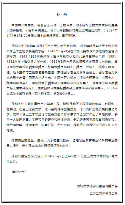 中国共产党党员、中国科学院院士、中国岩石力学与工程学会第三届理事会理事长、国际岩石力学与岩石工程学会副主席暨中国国家小组主席(1995-1999)、著名岩土及地下工程专家、地下结构工程力学学科的奠基人和开拓者孙钧先生,因病医治无效,于2024年3月1日21时58分在上海中山医院病逝,享年98岁。